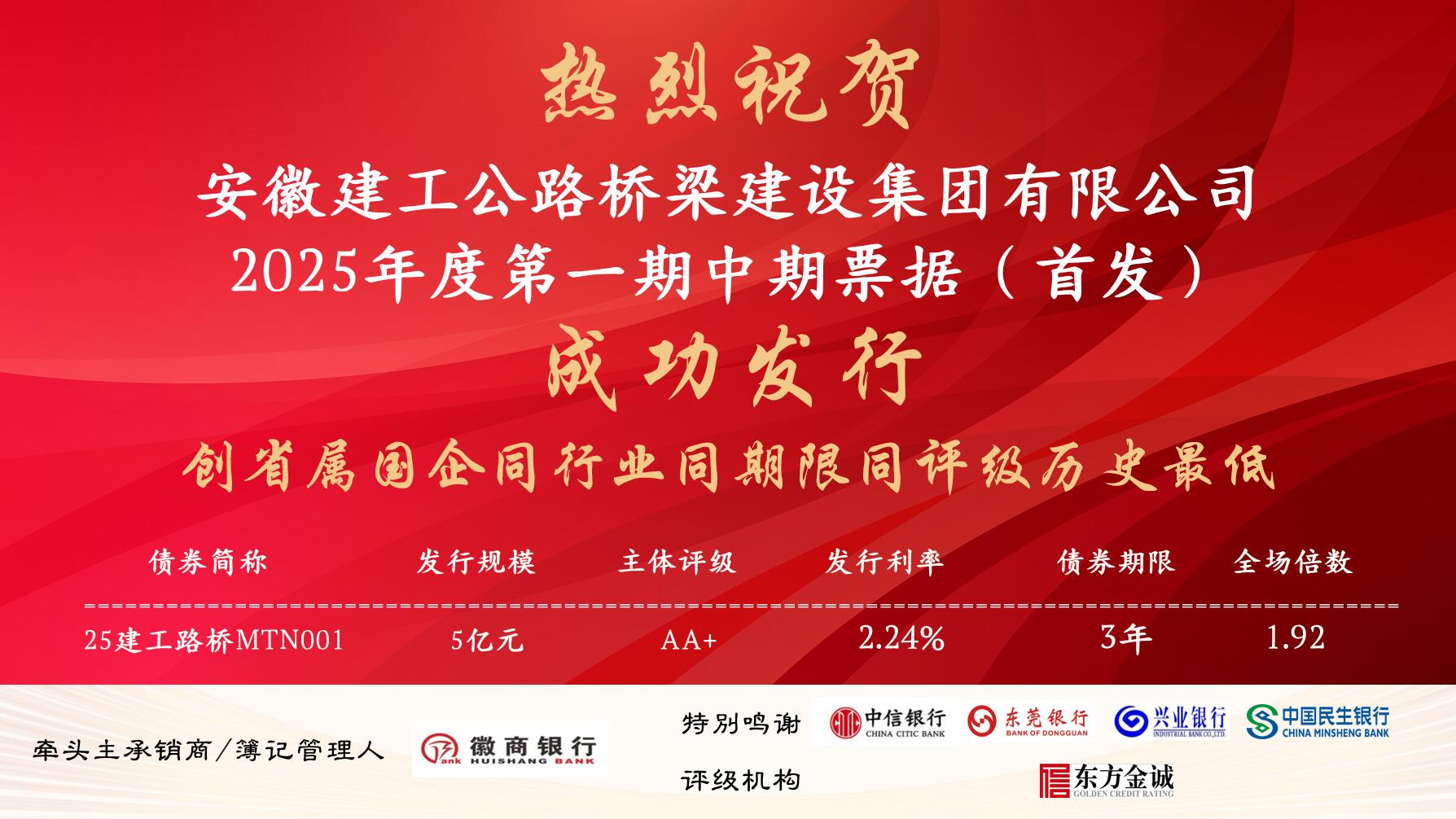 創(chuàng)利率新低!安徽建工公路橋梁建設(shè)集團(tuán)有限公司成功首發(fā)5億元中期票據(jù)