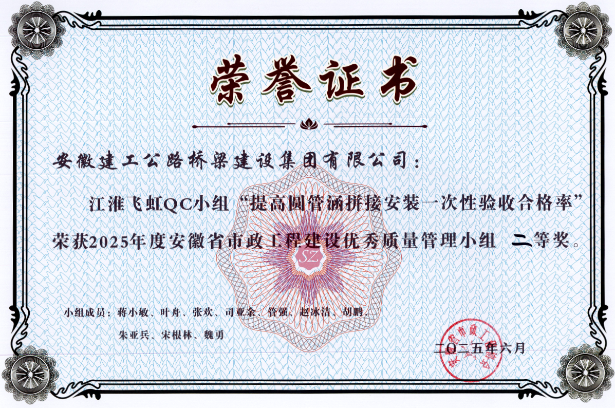 針對(duì)圓管涵等小結(jié)構(gòu)物外觀質(zhì)量通病,項(xiàng)目部成立“江淮飛虹”QC小組,聚焦混凝土質(zhì)量、模板工藝、振搗操作及養(yǎng)護(hù)管理等環(huán)節(jié)展開技術(shù)攻關(guān)。其課題《提高圓管涵拼接安裝一次性驗(yàn)收合格率》顯著提升了施工進(jìn)度與實(shí)體質(zhì)量,一次性驗(yàn)收通過省去了整改、復(fù)檢時(shí)間,確保圓管涵施工按計(jì)劃銜接后續(xù)工序,助力項(xiàng)目率先完成全線40道圓管涵施工;合格的拼接安裝減少了后期漏水、沉降、結(jié)構(gòu)開裂等隱患,提升了工程耐久性和質(zhì)量穩(wěn)定性。該成果有效降低了成本損耗、保障了工期推進(jìn),榮獲2025年度安徽省工程建設(shè)質(zhì)量與安全協(xié)會(huì)QC活動(dòng)一等獎(jiǎng)及安徽省市政工程建設(shè)優(yōu)秀質(zhì)量管理小組二等獎(jiǎng)。