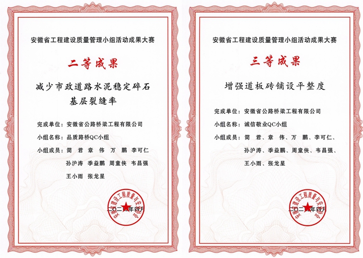 創(chuàng)新課題“積微成著”。憑借不同環(huán)境下的路基路面施工實踐,項目團隊持續(xù)開展技術攻堅和經(jīng)驗萃取。在路面基層施工階段,通過嚴格控制石粉含泥量,成功避免水穩(wěn)碎石基層裂縫,基層壓實度全面控制在96%以上;在附屬結構施工中,項目團隊對人行道板磚使用及鋪設進行改良,提升了路面觀感和行走舒適度。這些源于項目一線的創(chuàng)新案例,不僅提升了項目的建設質量和效率,更為后續(xù)的項目建設提供了寶貴的經(jīng)驗借鑒。相關QC成果在安徽省建設質量管理小組成果大賽中分別獲得二等獎和三等獎。